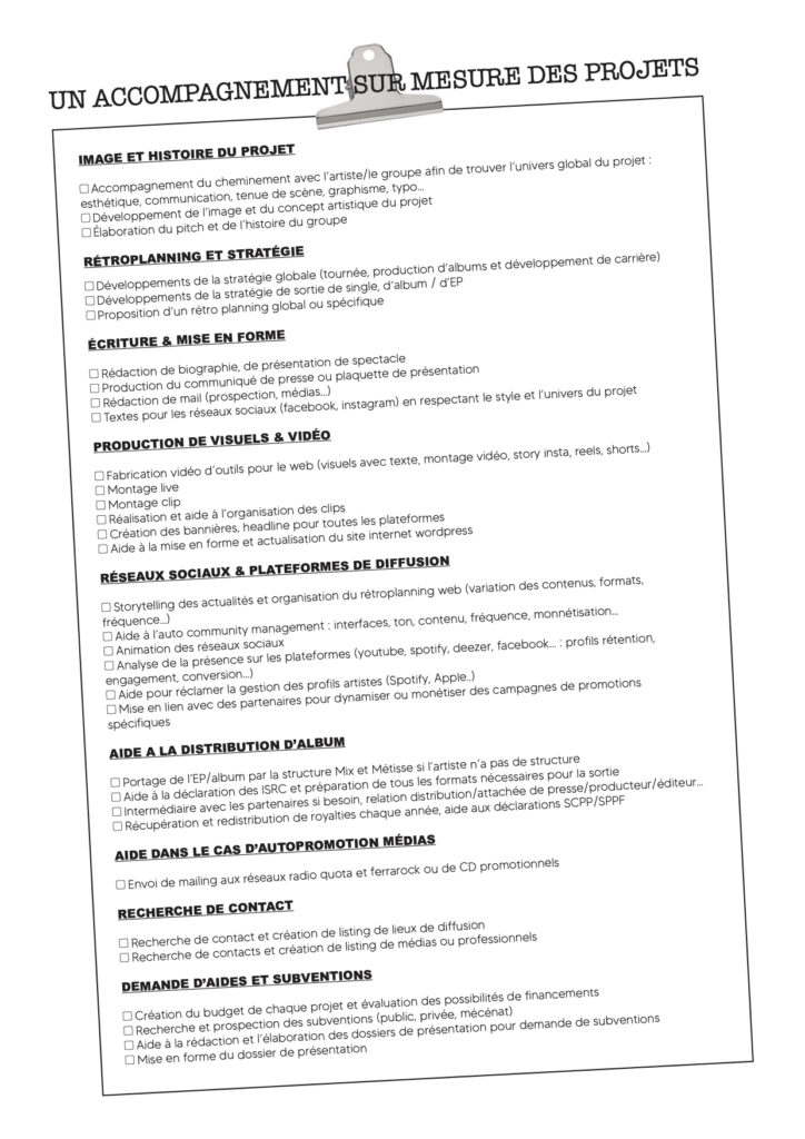 Plusieurs intervenants spécialisés sont impliqués dans le suivi : la création, la définition de l’intention artistique, la communication, l’identitée visuelle, la promotion (physique, digitale), développement de stratégie, la structuration professionnelle, production d’albums ou EP, contrats et administratif, aide à la constitution de dossier de demande de subvention, aide à la constitution d’une structure de diffusion ou de production.